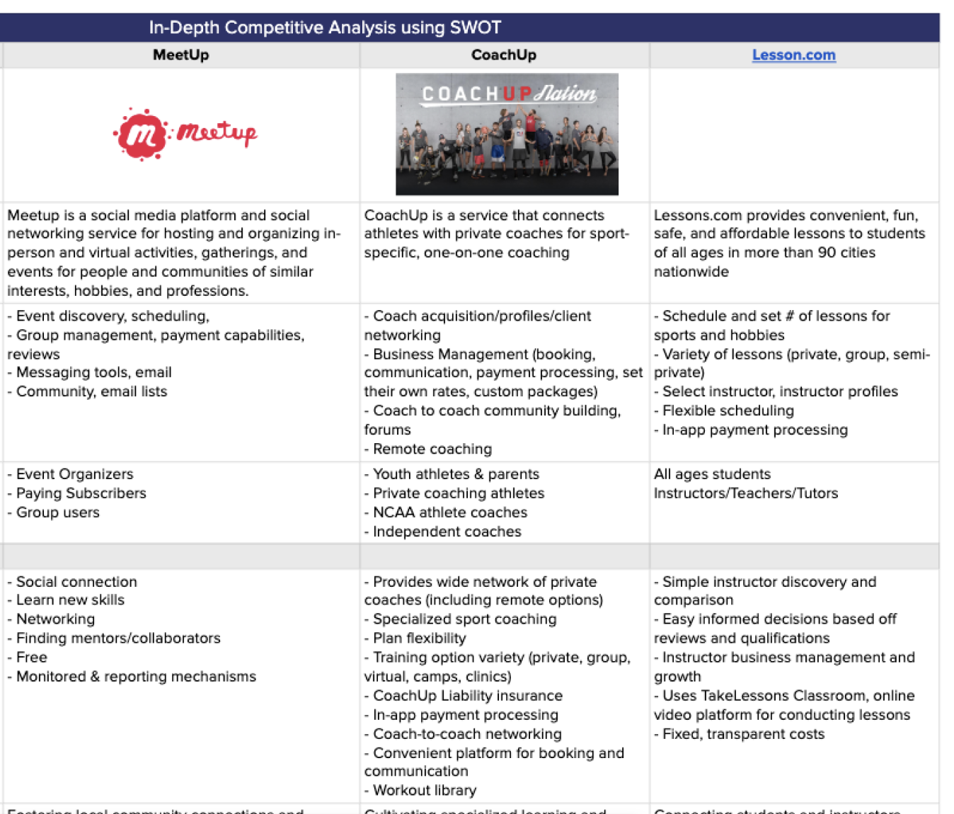 (Above) SWOT Analysis, MeetUp, CoachUp, Lessons.com-